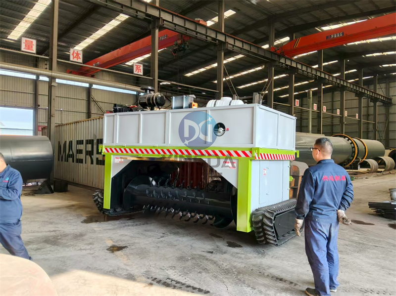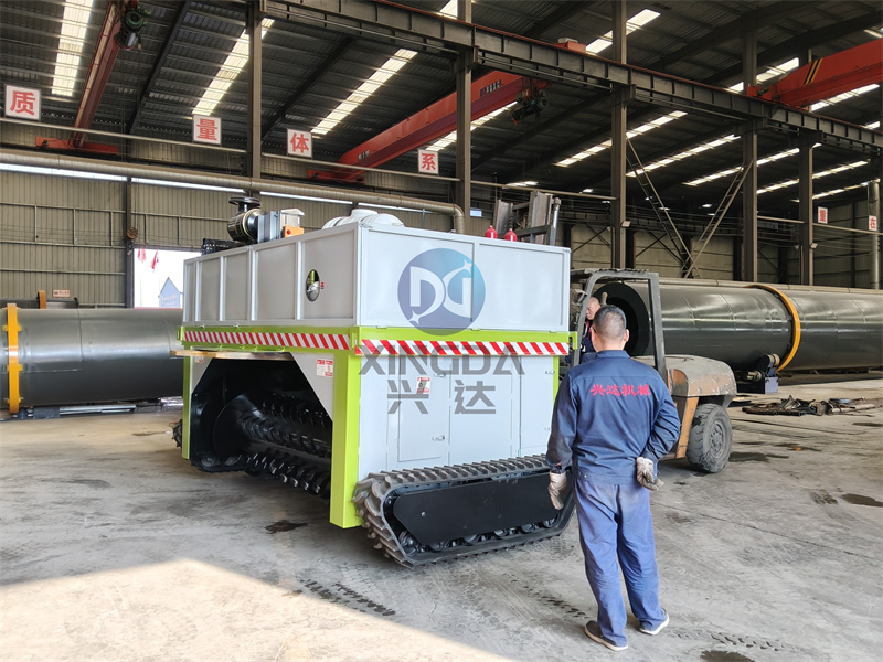 3000型有机肥履带翻堆机正在车间进行装箱准备发往海外市场:履带翻堆机是一种农业机械设备,主要用于大规模农场和牧场的堆肥处理。它通过其独特的履带设计,能够在各种地形上稳定移动,包括泥泞、不平或湿滑的地面。这种设备通常配备有强大的旋转刀片系统,能够有效地将有机废物、秸秆、粪便等物料进行翻动和混合,促进空气流通,加速分解过程。