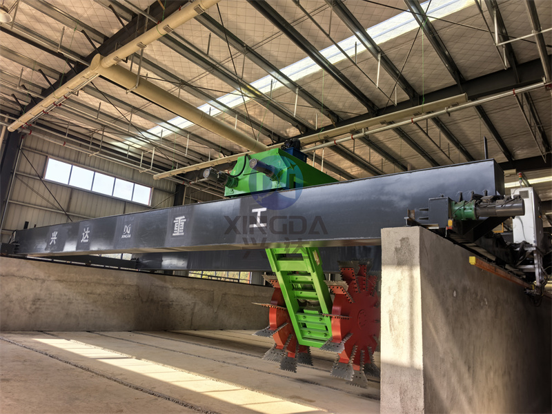 随车人员抵达现场后对大跨度翻抛设备轮盘式翻抛设备的安装现场:轮盘式翻抛机是整套有机肥生产线中的一款有机肥翻堆设备。在有机肥生产线中担当起到翻抛物料的作用。轮盘式翻抛机设备 采用中间链条传动机构,带动两大直径翻抛轮盘,对称翻抛,无死角可调速移位小车,左右位移,低能耗完成大跨距翻抛工作。在堆放物料深度较深的情况下,通过的节能型传动机构,使用较小的动力,来完成高深度、大跨距的翻刨作业。